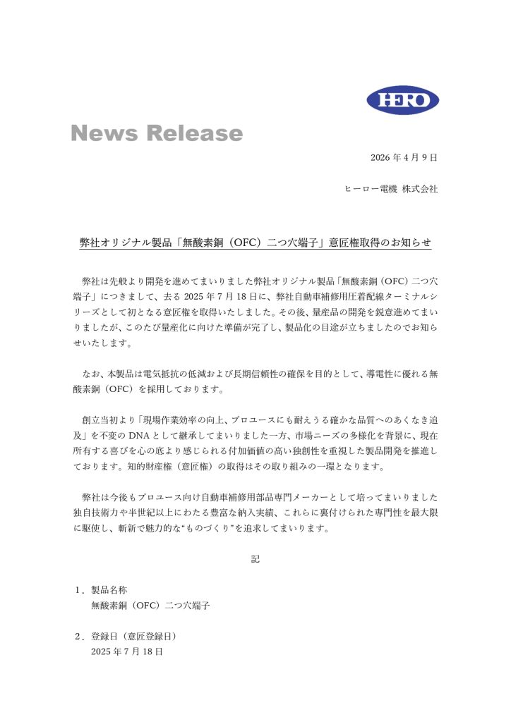 弊社は去る2025年(令和7年)7月18日に弊社自動車補修用圧着配線ターミナルシリーズとしては初となる「意匠権」を取得いたしました。その後、量産化に向けた開発を進め、このたび製品化の目途が立ちましたのでお知らせいたします。