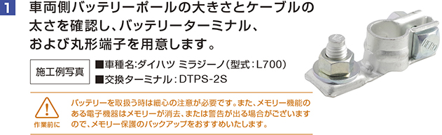 - バッテリーターミナル交換の際はショート防止のため工具の取り扱いと周辺の導電物に注意してください。