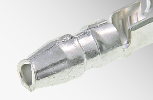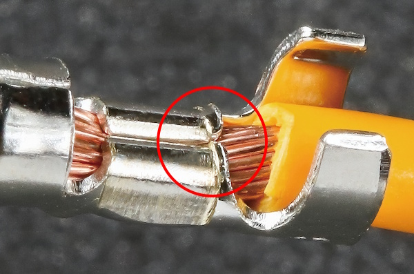 端子を圧着(かしめ)した際に、ワイヤーバレル端部に形成される釣鐘状(ベル形状)の広がりを指し、この仕上がりを「ベルマウス」と呼びます。ベルマウスは、引張強度を安定させるとともに、自動車の走行時などで発生する振動により配線が揺れた場合に、芯線がワイヤーバレル端部と擦れて断線するのを防ぐ役割があるとされています。