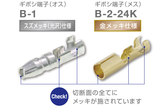 プロユースにも信頼の高いギボシ端子として、メッキ処理にもこだわり、品質を徹底的に追求。製品プレス加工後に、スズメッキ(光沢)または24Kメッキ(金メッキ)処理を行なうことで製品表面はもとより切断面にもメッキ処理が施され、腐食防止による導電性低下の防止に寄与いたします。