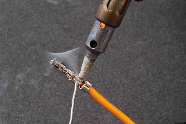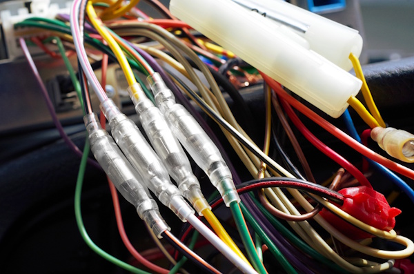 半田付けは一見すると強固に固定できる方法ですが、自動車は走行時に常に振動が発生します。半田で固められた電線はしなやかさを失い、振動によって金属疲労が蓄積し、最悪の場合は半田部分が折れ断線する恐れがあります。ギボシ端子やコネクタ(カプラー)などの専用端子と圧着工具を用いた接続が基本とされております。