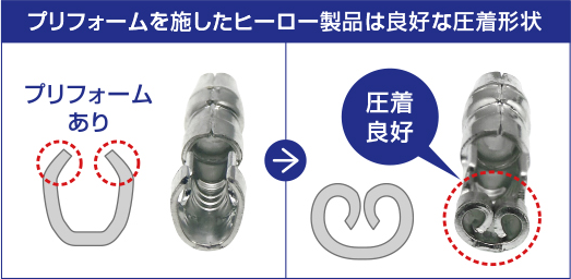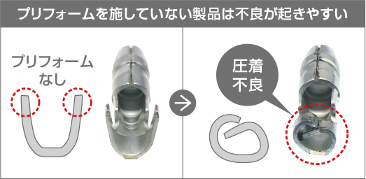 プリフォームが施されていない製品は、圧着した際カシメ不良を起こしやすいため、圧着前にバレルを少し狭めたり、バレル先端を少し曲げたり等、端子に細工を必要とする場合があり、作業工程が増えてしまいます。