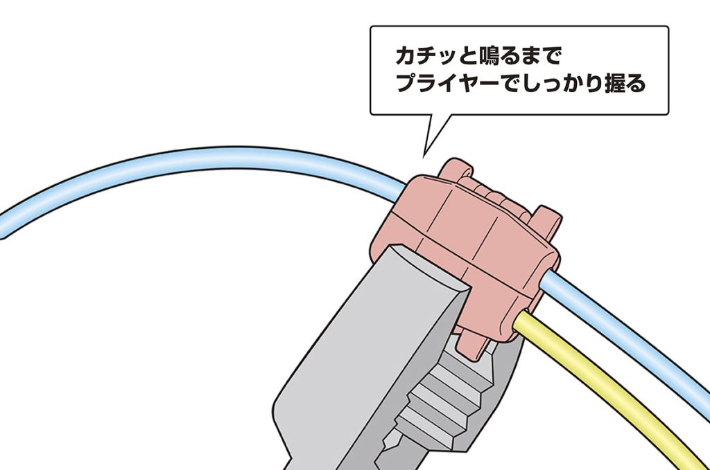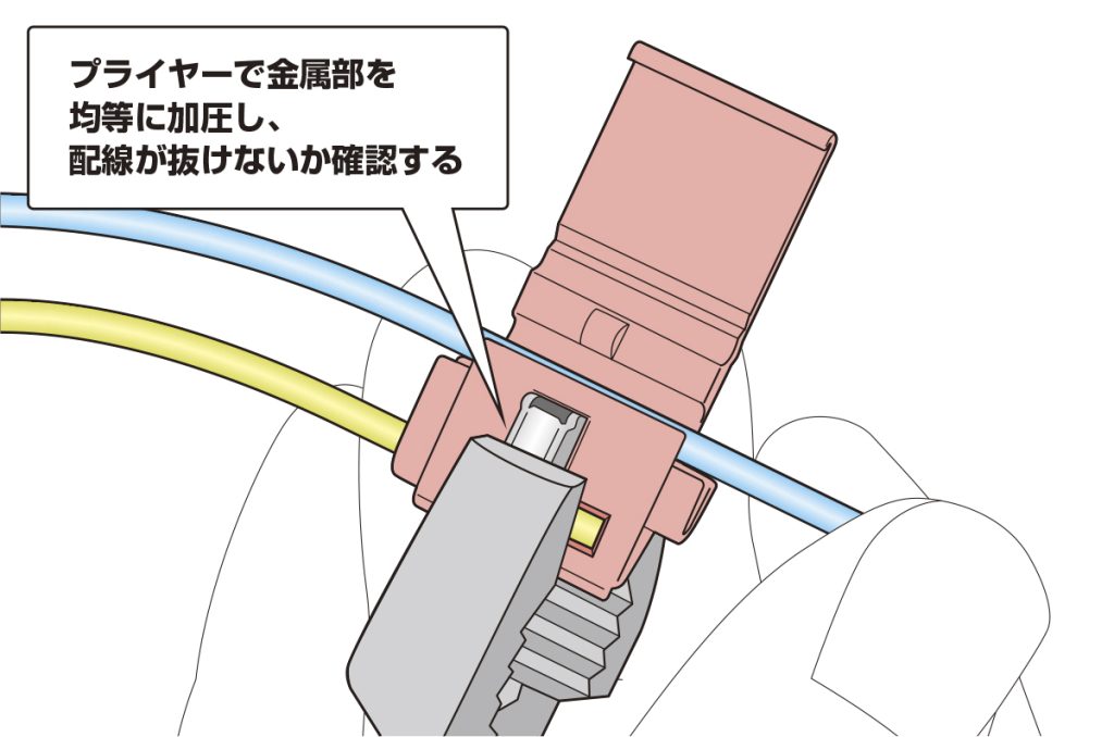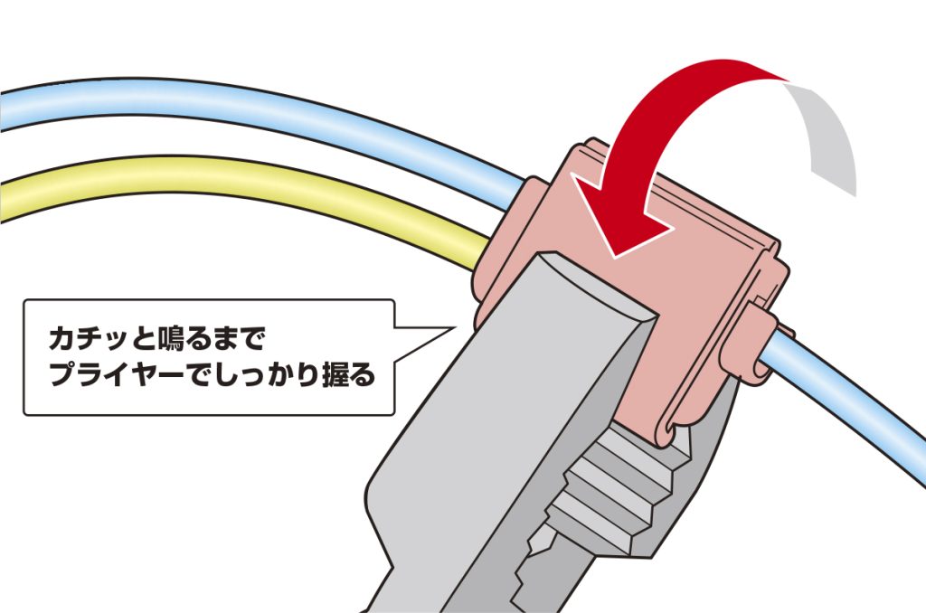 手順4 分岐線側のハウジング折り返しプライヤーで加圧し、ハウジングのロックが掛かったことを確認する