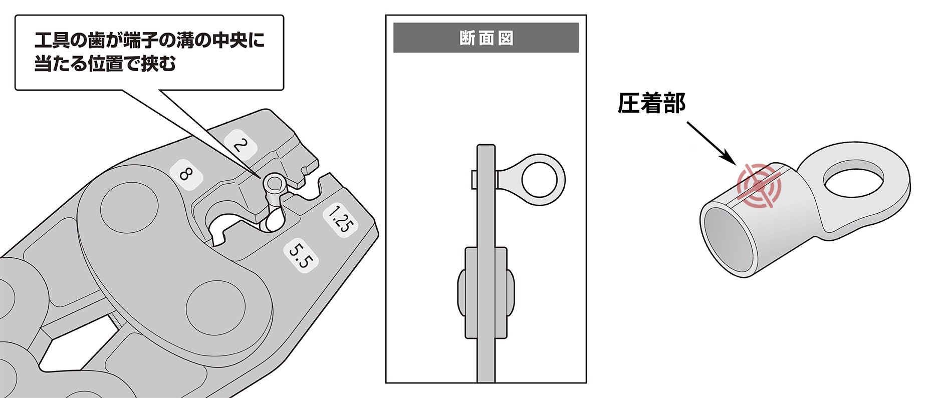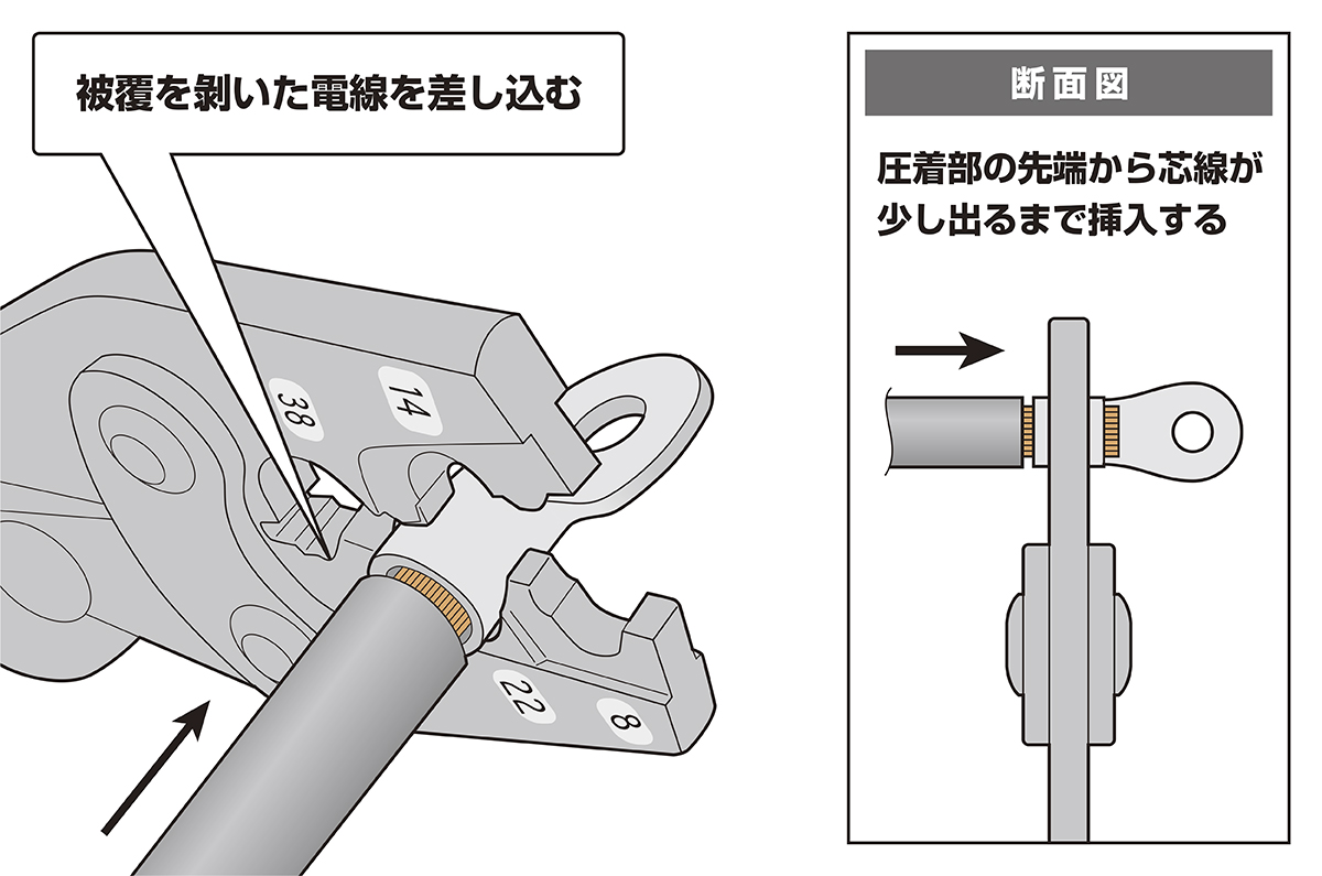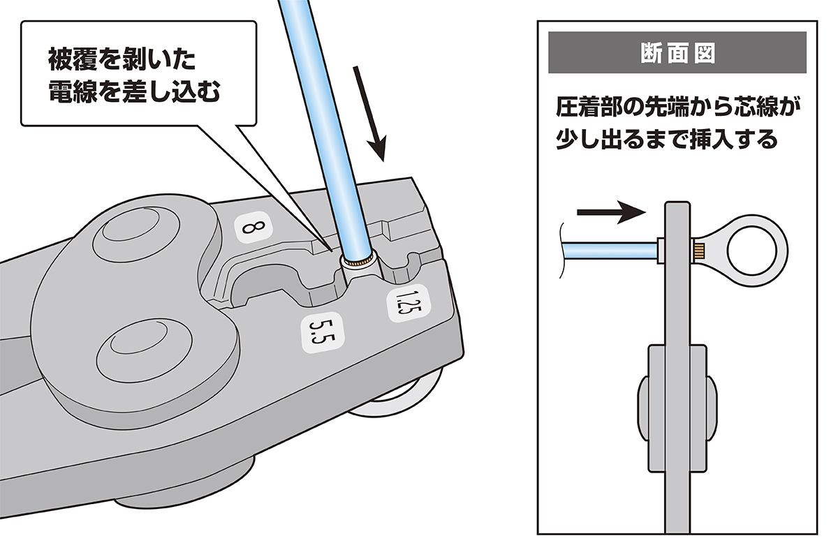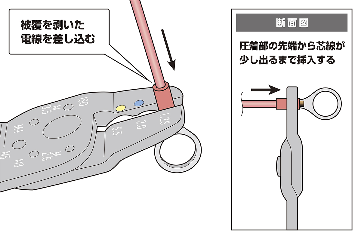 使用する電線に適合する丸形端子を選定し、丸形端子の圧着部(図を参照)に圧着工具の歯が合う位置で挟む(※圧着位置がずれると、電線が抜けたり、正しく圧着できない場合があります)