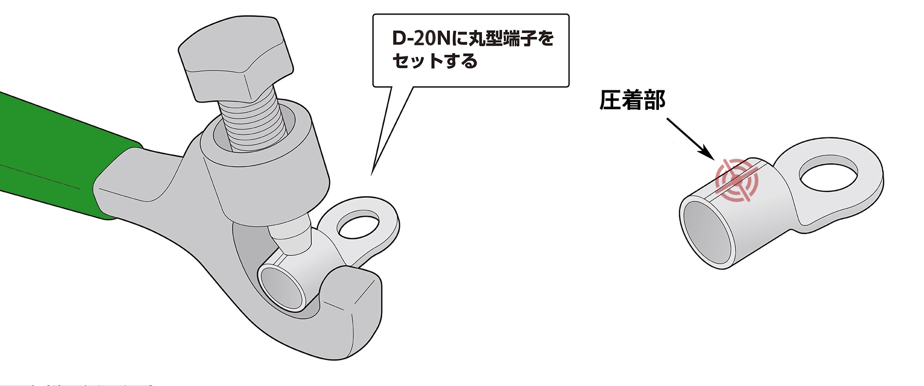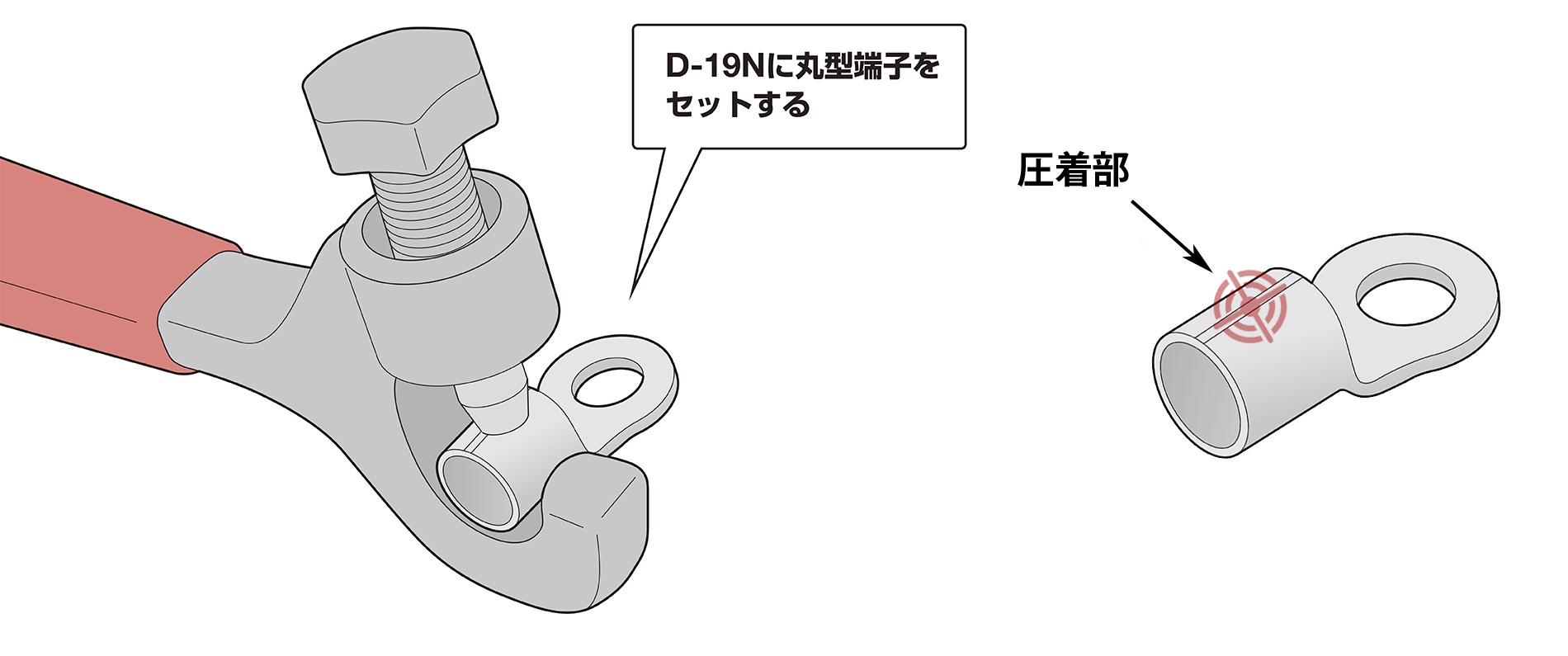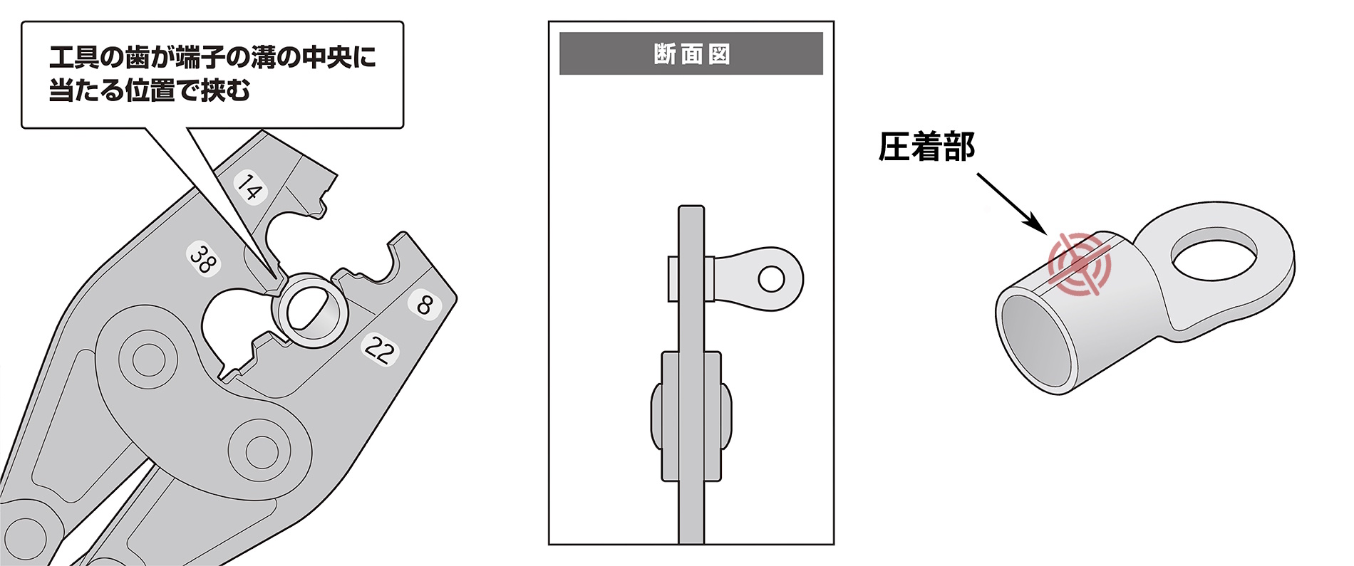 使用する電線に適合する丸形端子を選定し、丸形端子の圧着部(図を参照)に圧着工具の歯が合う位置で挟む(※圧着位置がずれると、電線が抜けたり、正しく圧着できない場合があります)