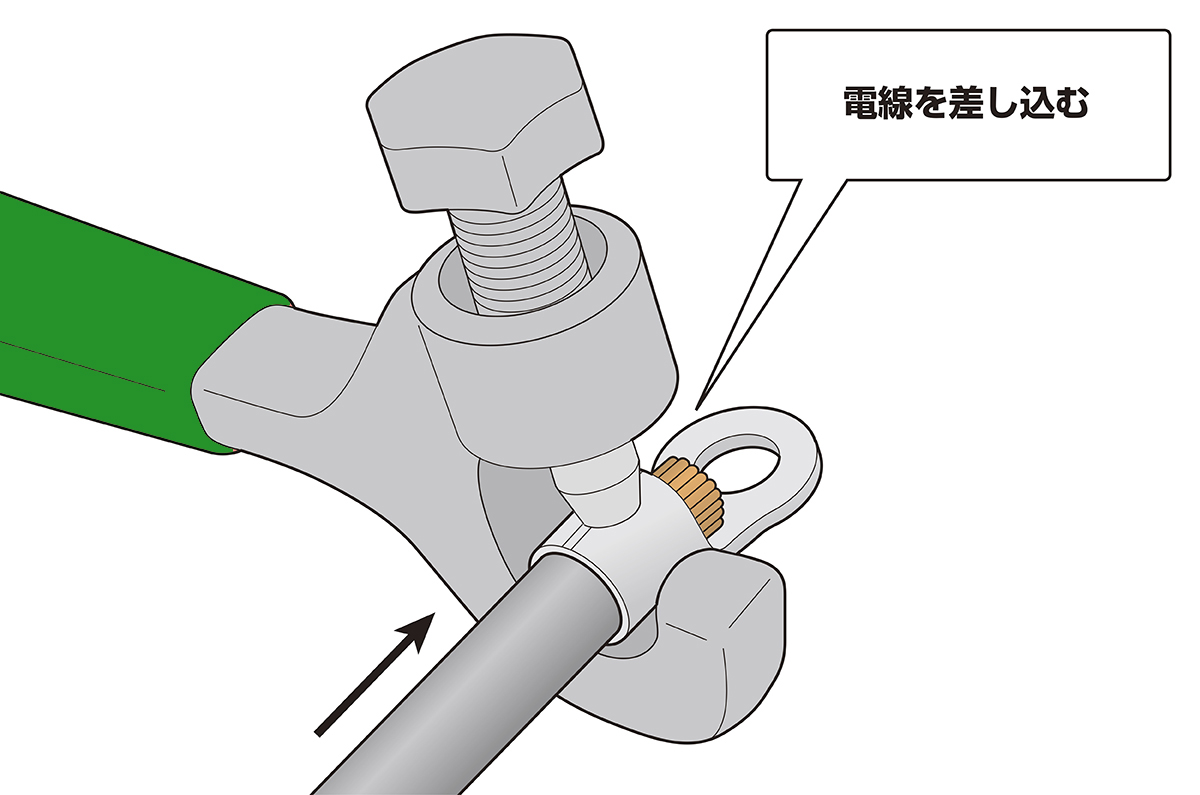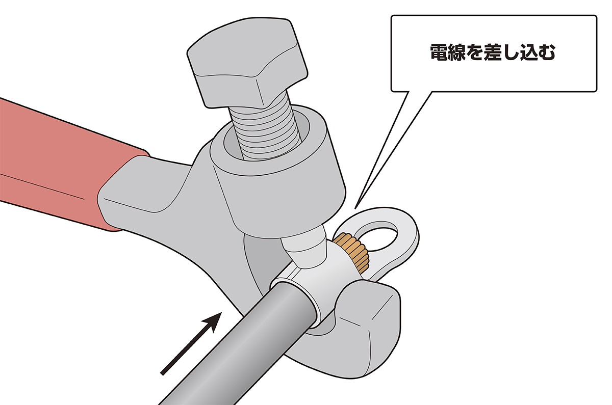 手順2 丸形端子の圧着部(図を参照)に簡易圧着工具のボルト先端部をセットする(※圧着位置がずれると、電線が抜けたり、正しく圧着できない場合があります)