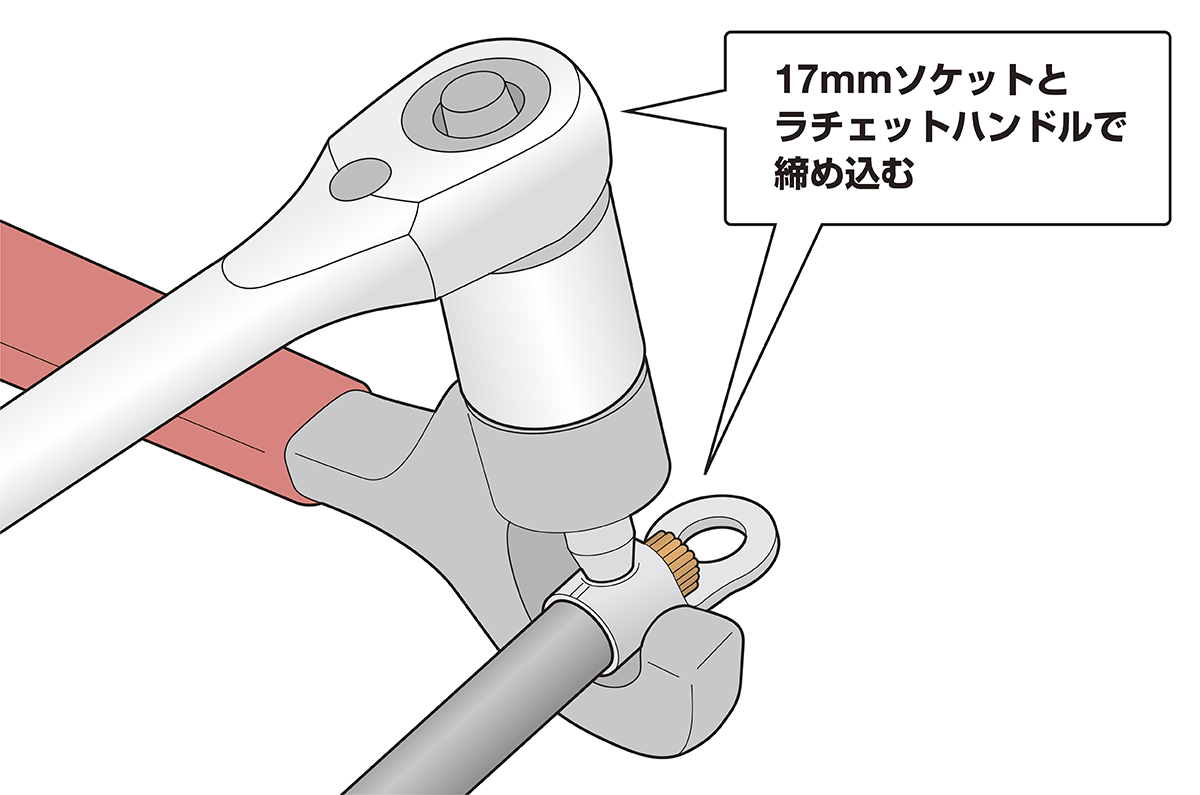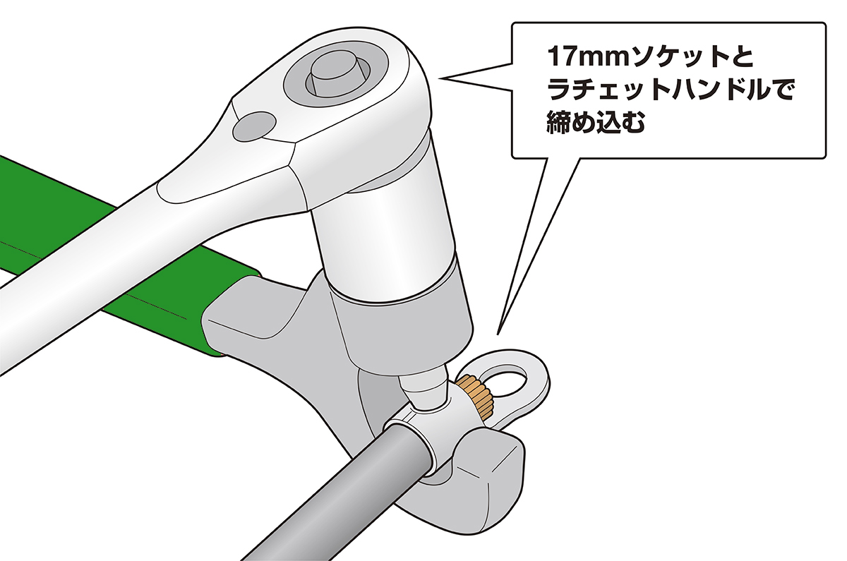 手順4 17mmのラチェットレンチを用いて丸形端子を圧着する(※圧着時はボルト部にグリスを塗布してください)