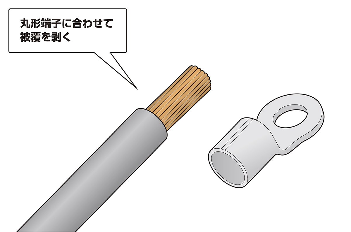 手順1 使用する電線に適合する丸形端子を選定し、圧着する部分の被覆を剥いて芯線を出す