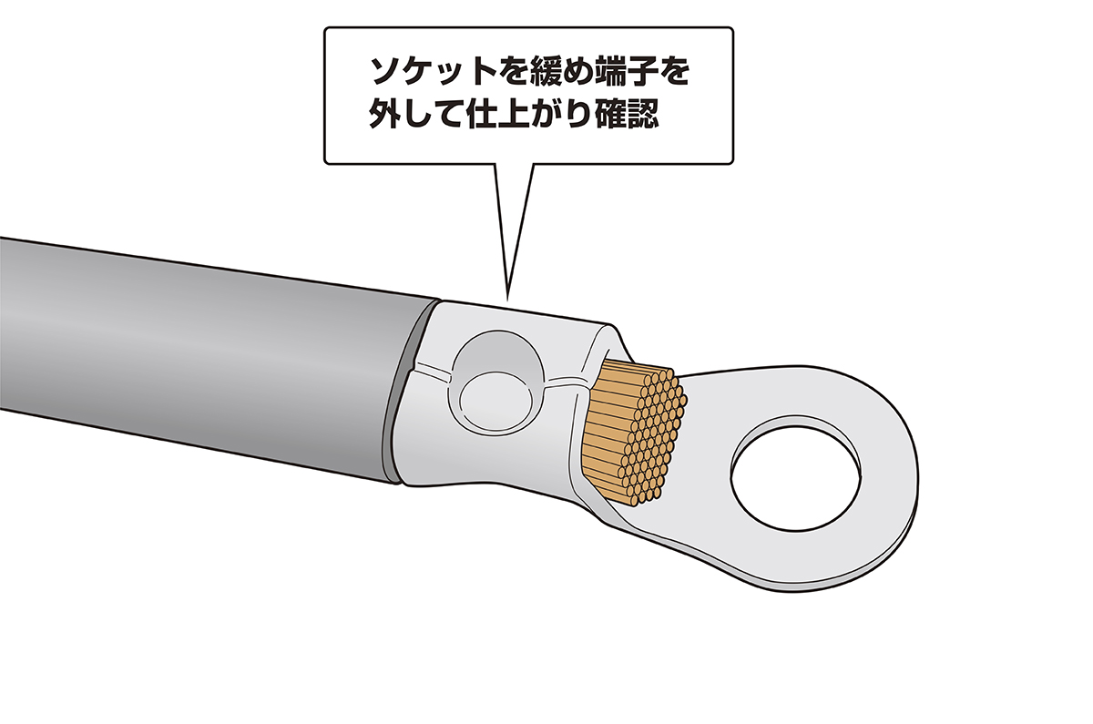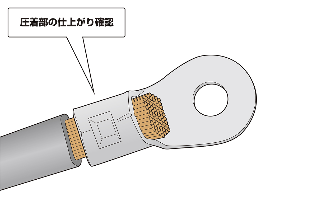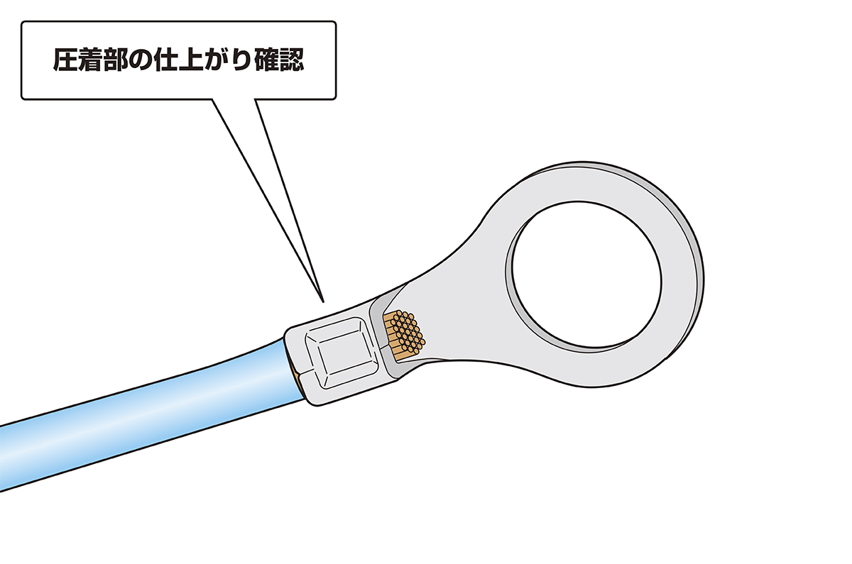 手順4 圧着した丸形端子の圧着部仕上がりを確認する(※電線の抜け、芯線のはみ出し、圧着不足がないかを確認してください)