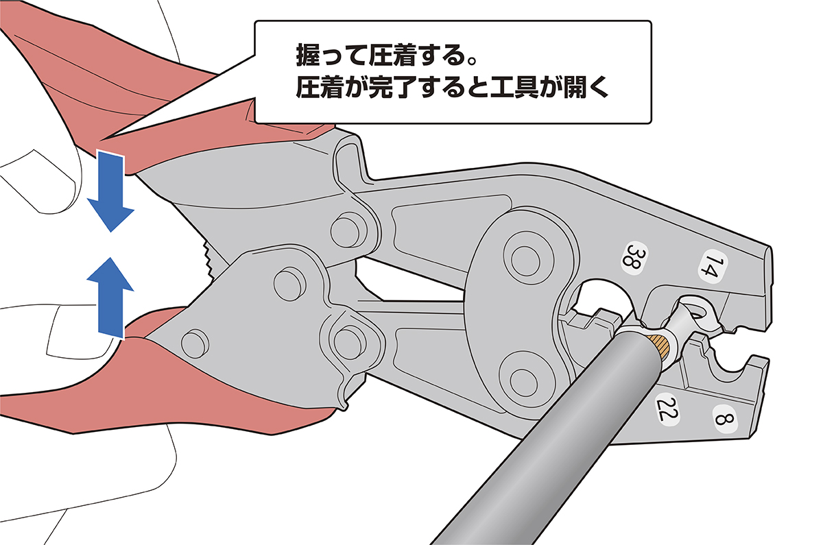 手順3 圧着工具のグリップをしっかりと握り、丸形端子を圧着する。(※指や他の配線の挟み込みが無いか、必ず周囲を確認してから作業してください)