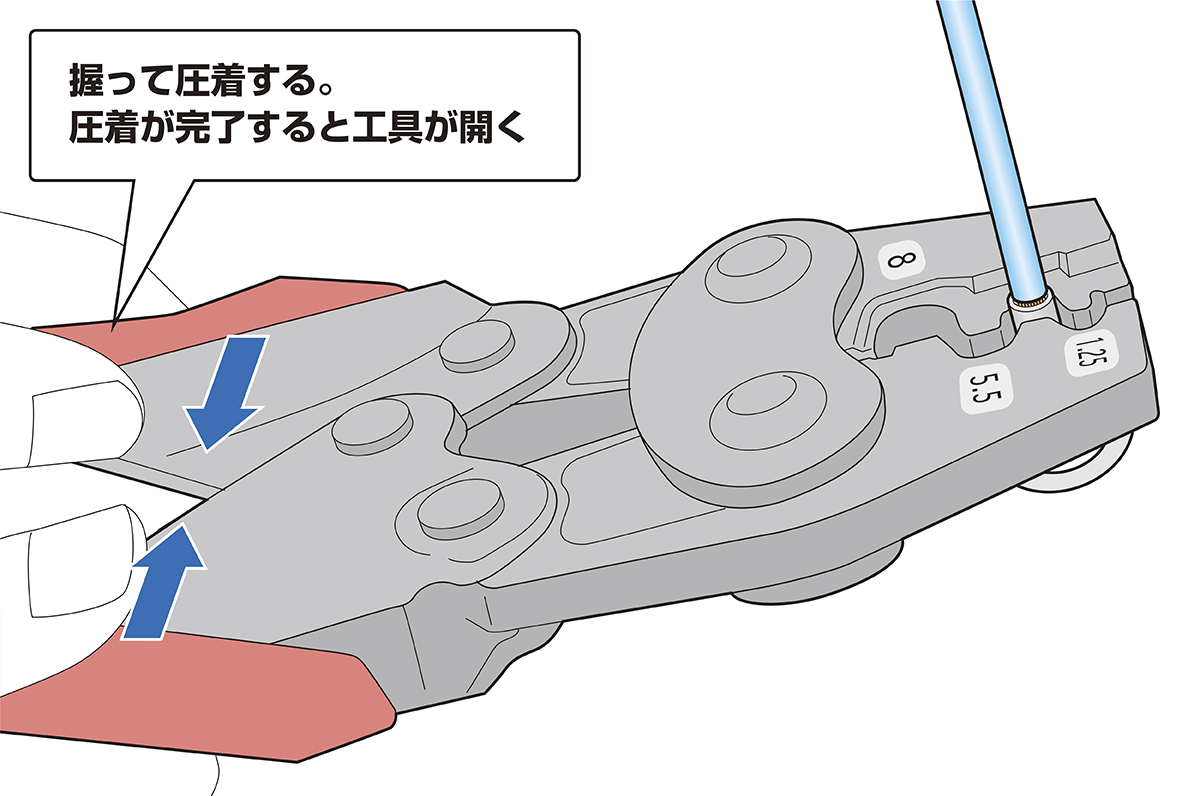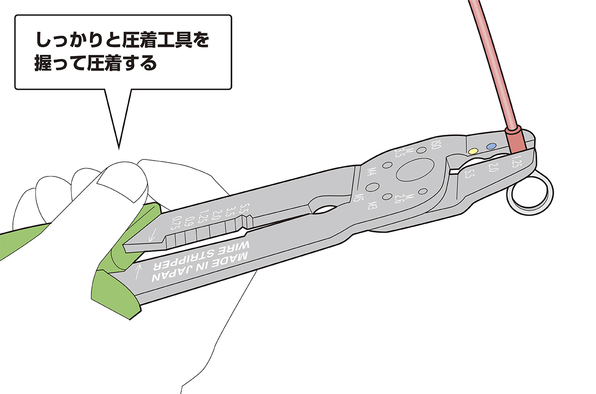 手順3 圧着工具のグリップをしっかりと握り、丸形端子を圧着する(※指や他の配線の挟み込みが無いか、必ず周囲を確認してから作業してください)