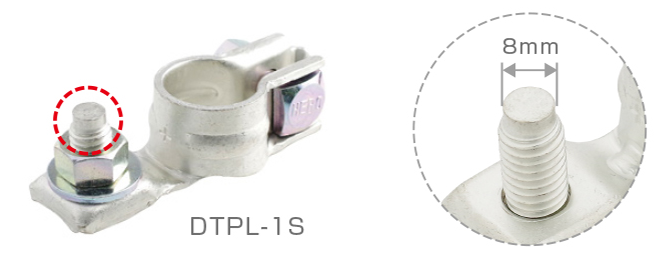 ボルトタイプのバッテリーターミナルに丸形端子を装着する場合には、バッテリー本体側の縦ボルトサイズ、および丸形端子の適合ボルト穴径を確認の上、丸形端子を装着いたします。