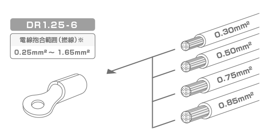 【例】丸形端子(品番:DR1.25-6)に合致する電線抱合範囲(撚線)について