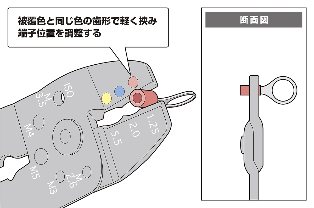 手順1 使用する電線に適合する絶縁被覆付丸形端子を選定し、工具表面に表示されている色付きの丸(被覆色と同じ色)に対応する歯形で軽く挟み、端子位置を調整する