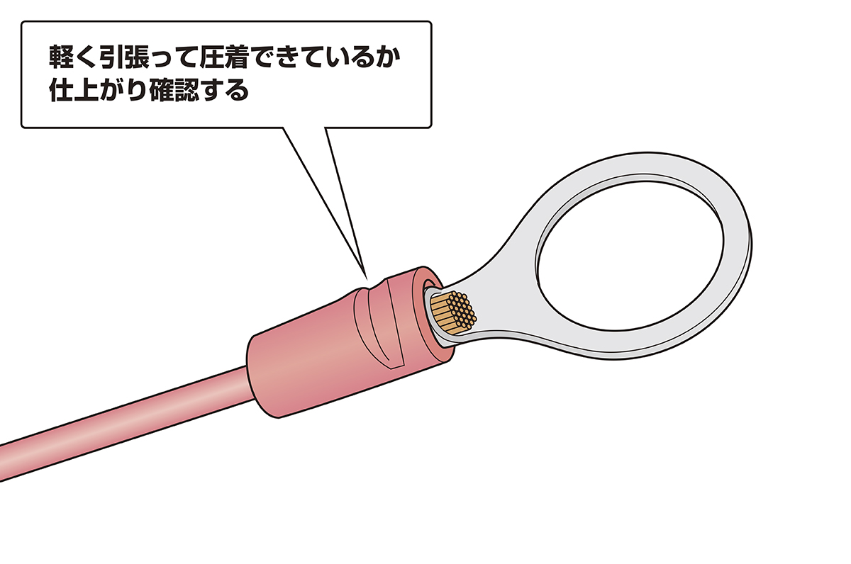 手順4 圧着した絶縁被覆付丸形端子の圧着部仕上がりを確認する(※電線の抜け、芯線のはみ出し、圧着不足がないかを確認してください)