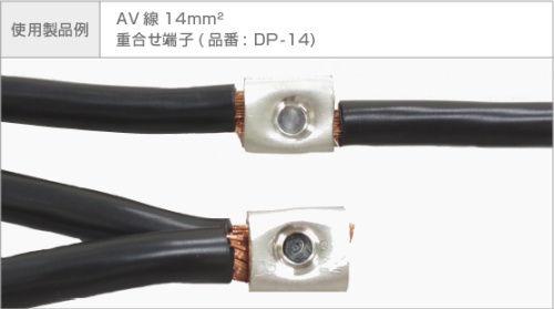 重合せ端子は、2本以上の電線を接続(延長・まとめ・分岐)する際に使用する「筒状」の製品です。電線の被覆を剥いた芯線を端子の中に入れた際に電線(芯線)が重なることから“重合せ端子”と呼ばれます。端子に適合した圧着工具で圧着する(かしめる)ことで接続が出来ます。