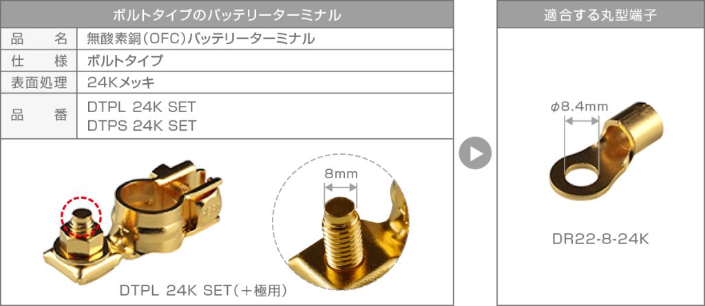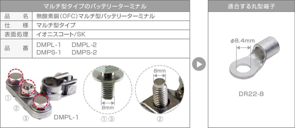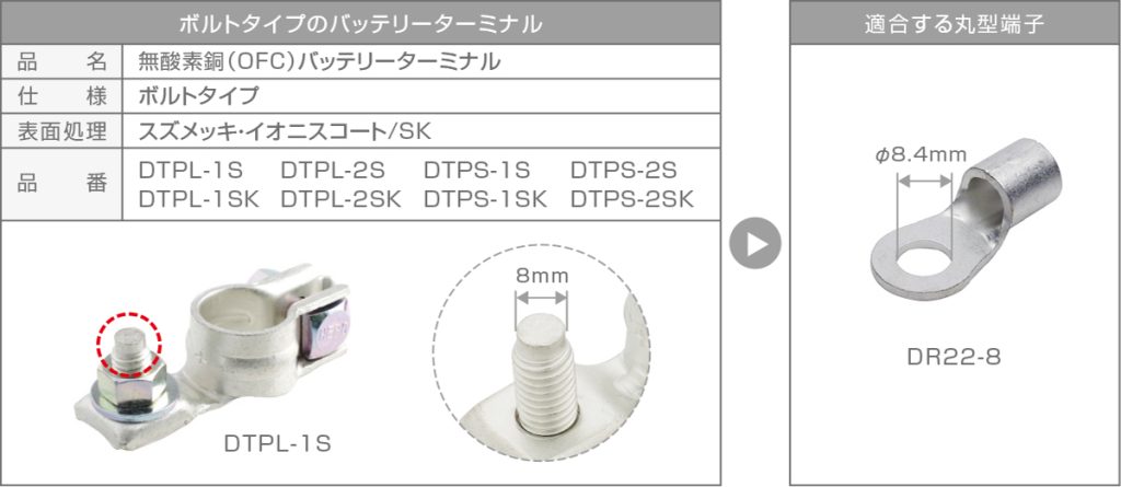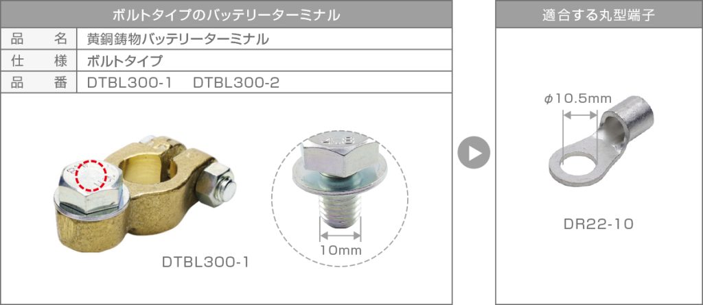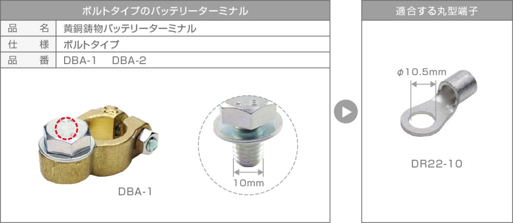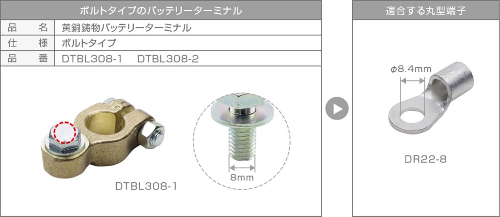 ボルトタイプ、マルチ型タイプの各バッテリーターミナルは、丸形端子(DRシリーズ)を併用してバッテリー(鉛蓄電池)本体に装着します。